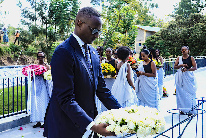Igikorwa cyasojwe no gushyingura mu cyubahiro imibiri 73 y’abazize Jenoside yakorewe Abatutsi no gushyira indabo ku rwibutso rushyinguyemo abazize Jenoside yakorewe Abatutsi rw’Amayaga.